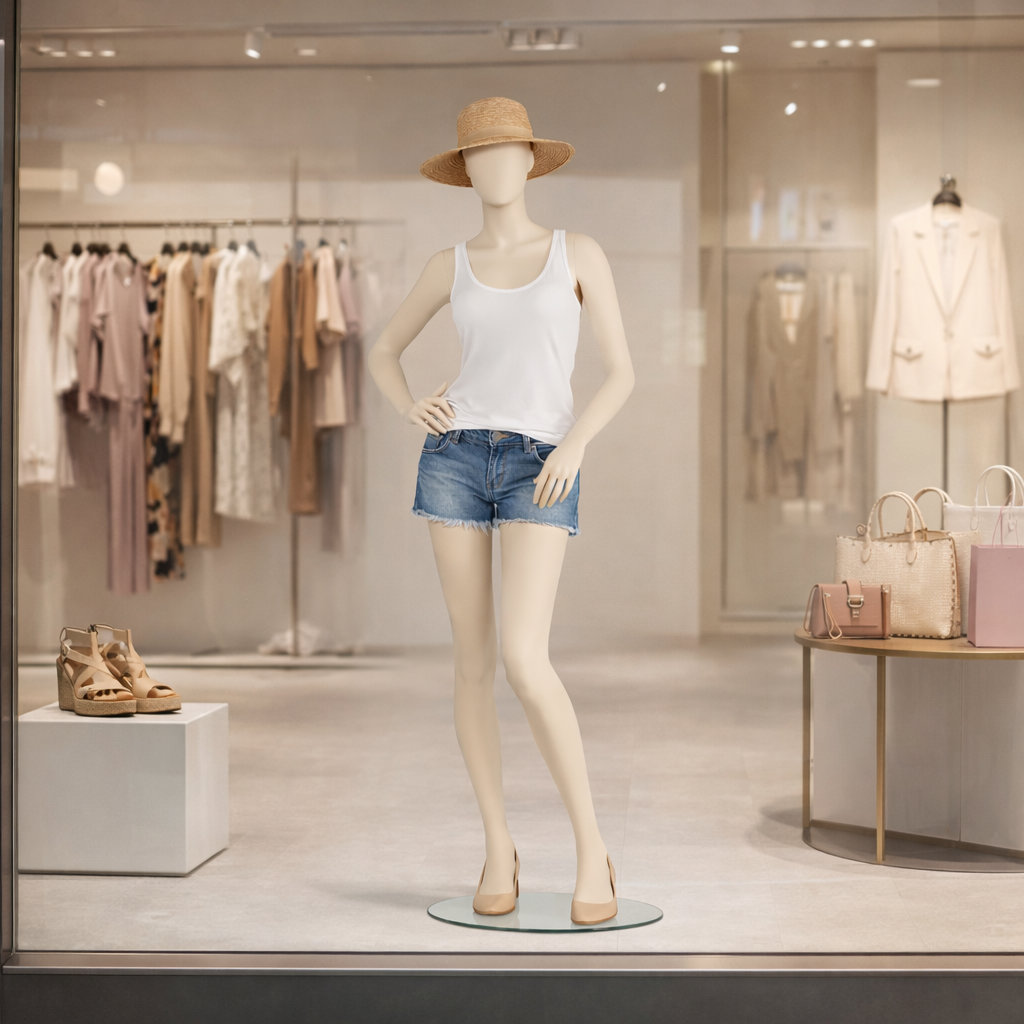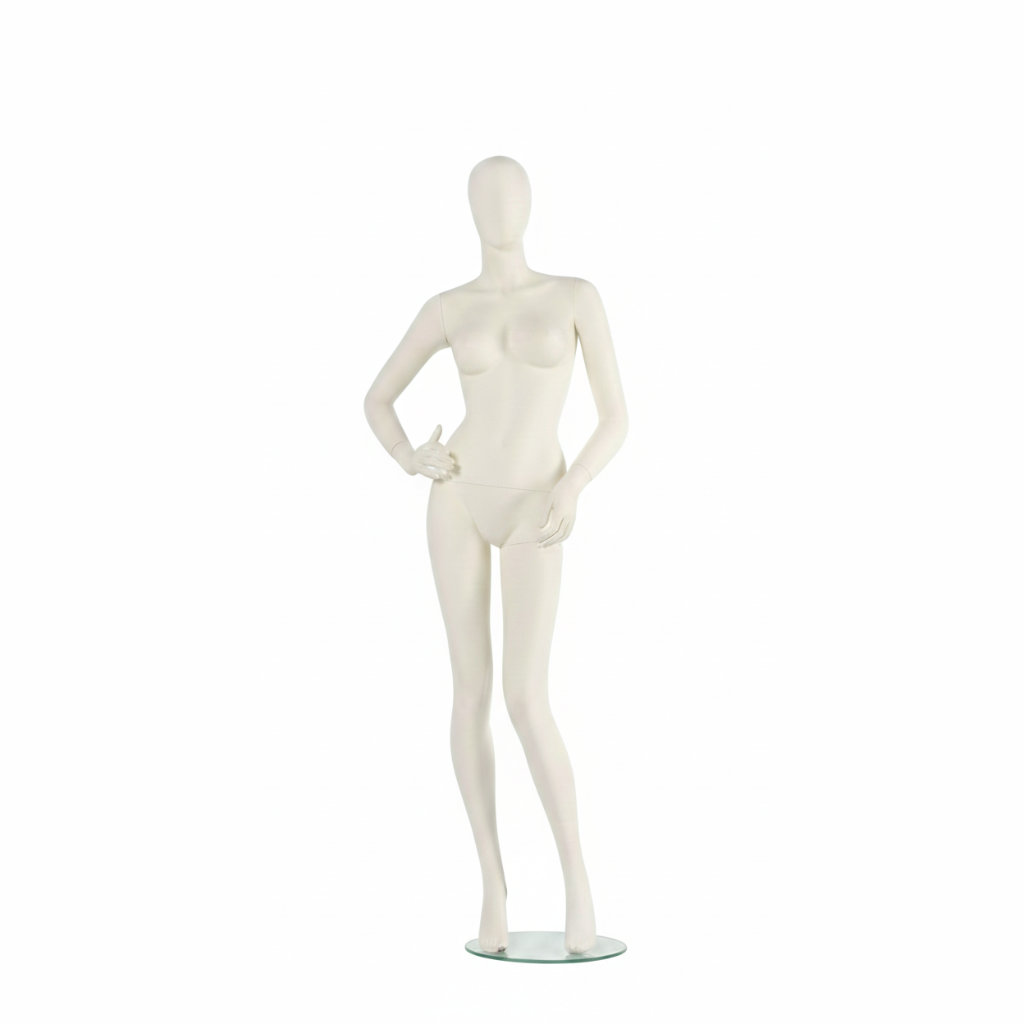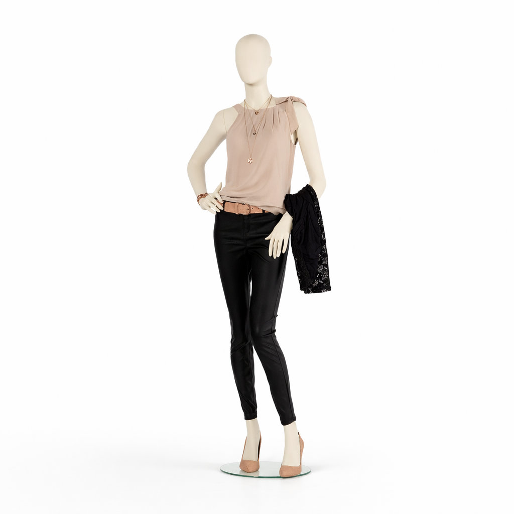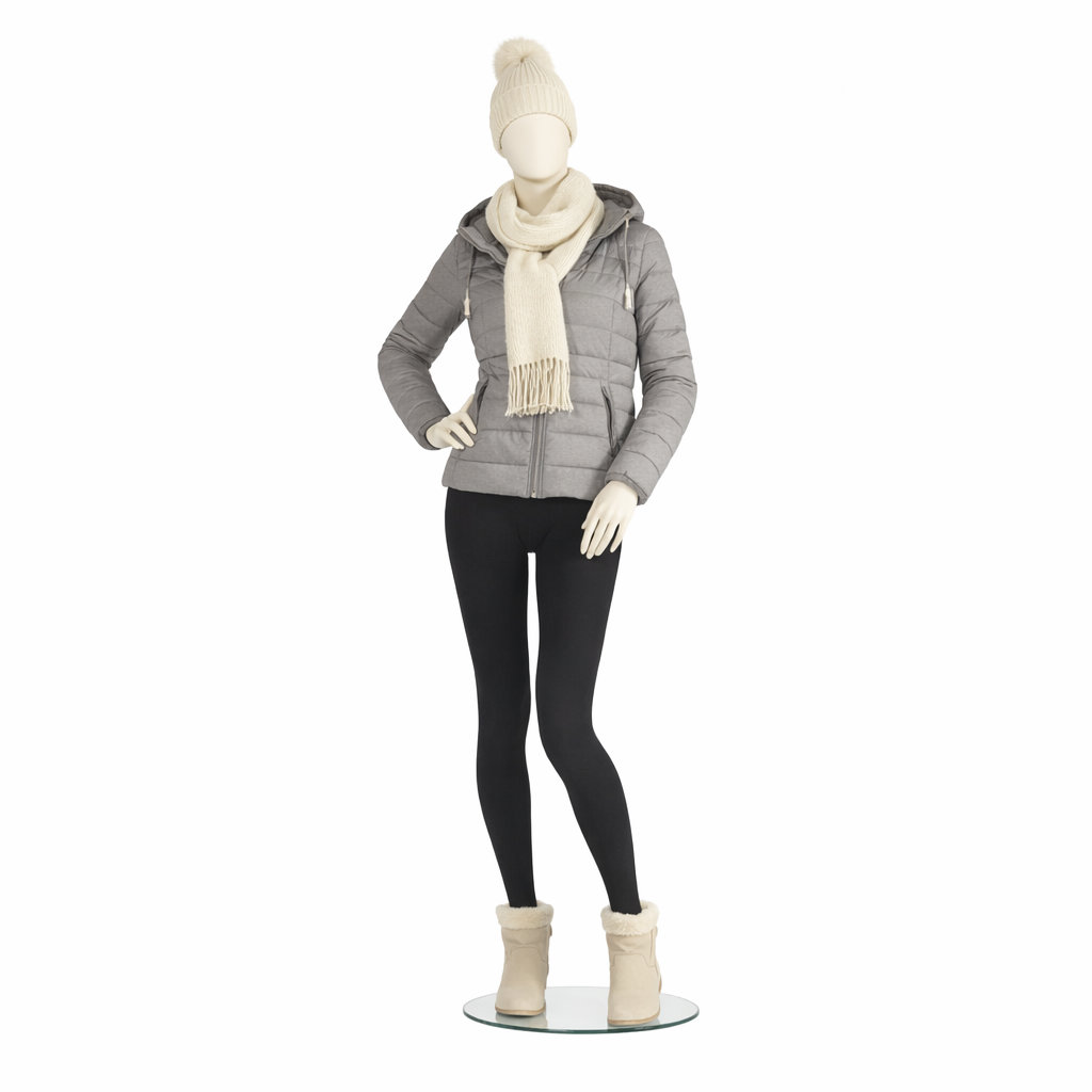 - Lieferumfang: Schaufensterpuppe inkl. runder Glasstandplatte
