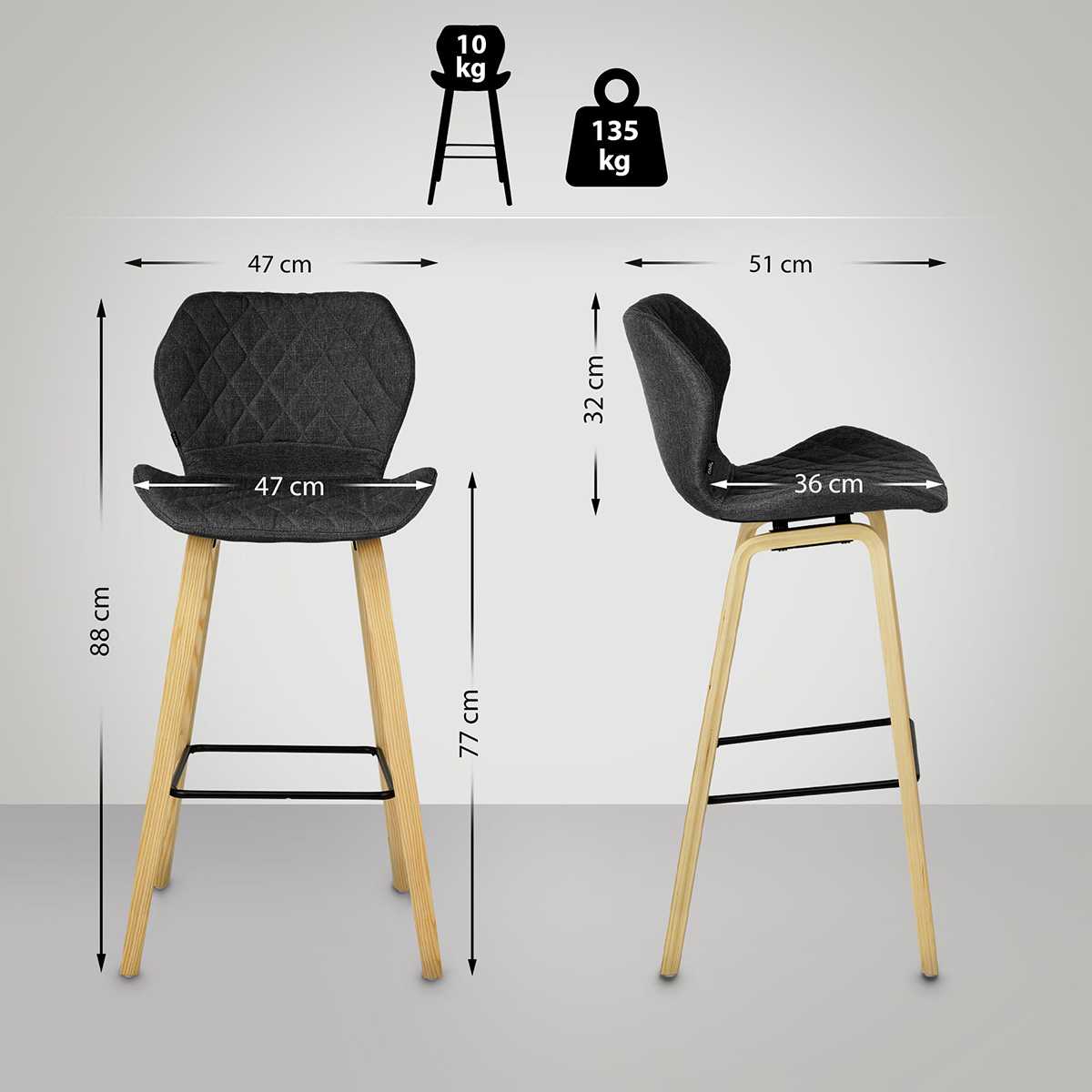 Ebenjenes Vierfußgestell aus stabilem Holz gewährleistet einen sicheren Stand des Stuhls. Dabei kann der Barstuhl bedenkenlos bis 135 kg belastet werden. Dank der Bodenschoner unter den Stuhlbeinen werden empfindliche Böden dabei nicht beschädigt.
