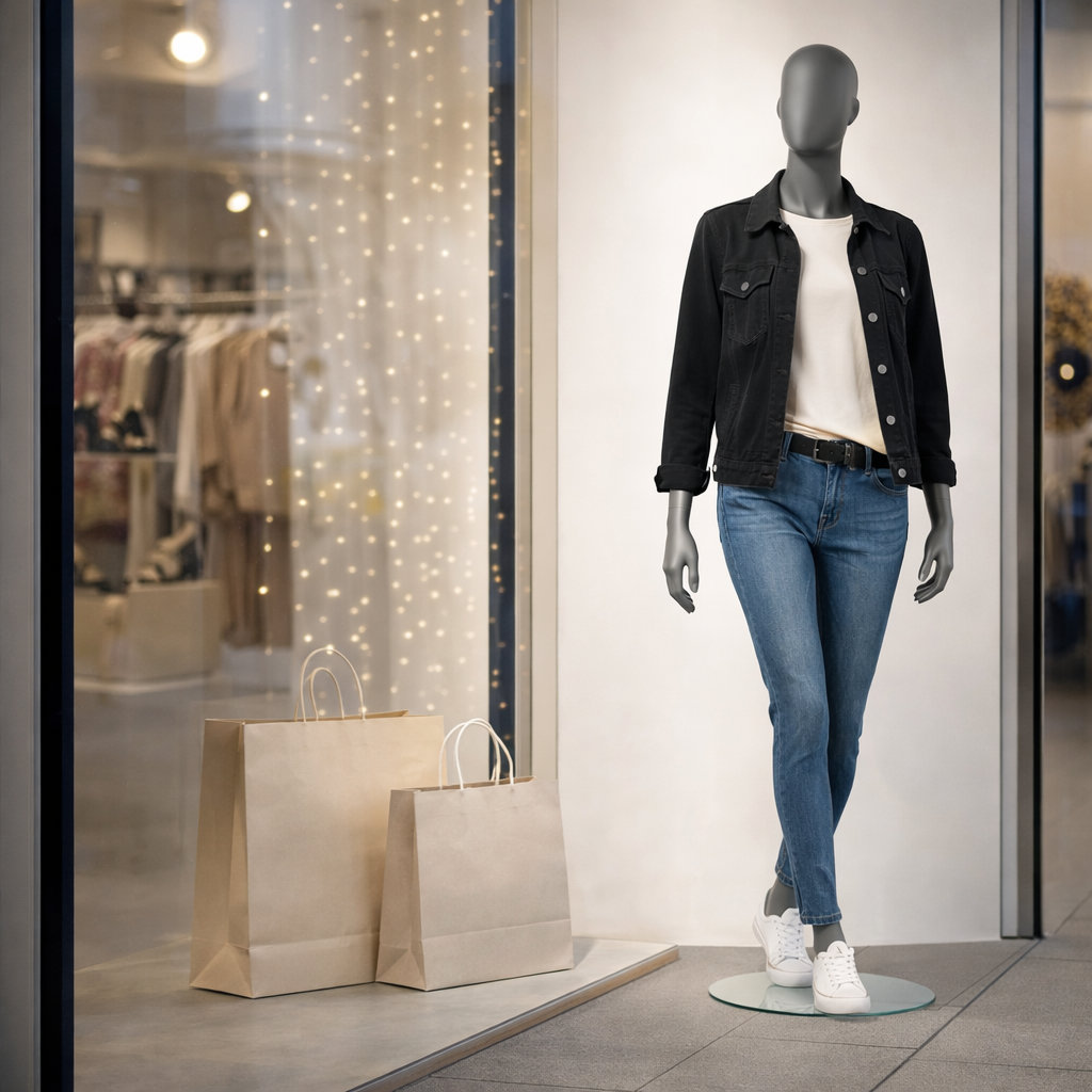 - Lieferumfang: Schaufensterpuppe inkl. runder Glasstandplatte