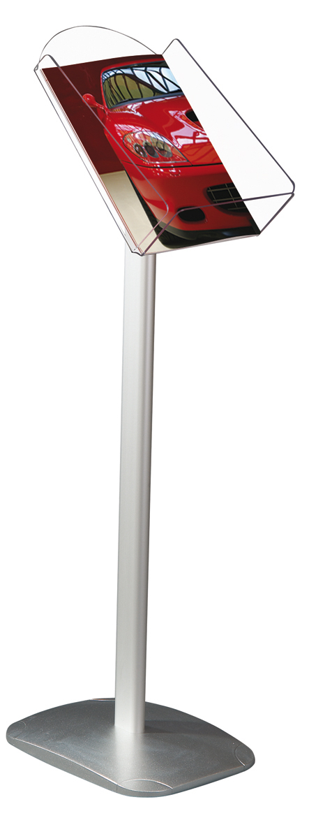 - Prospektständer mit silberfarbiger Bodenplatte und zentralem Ovalprofil