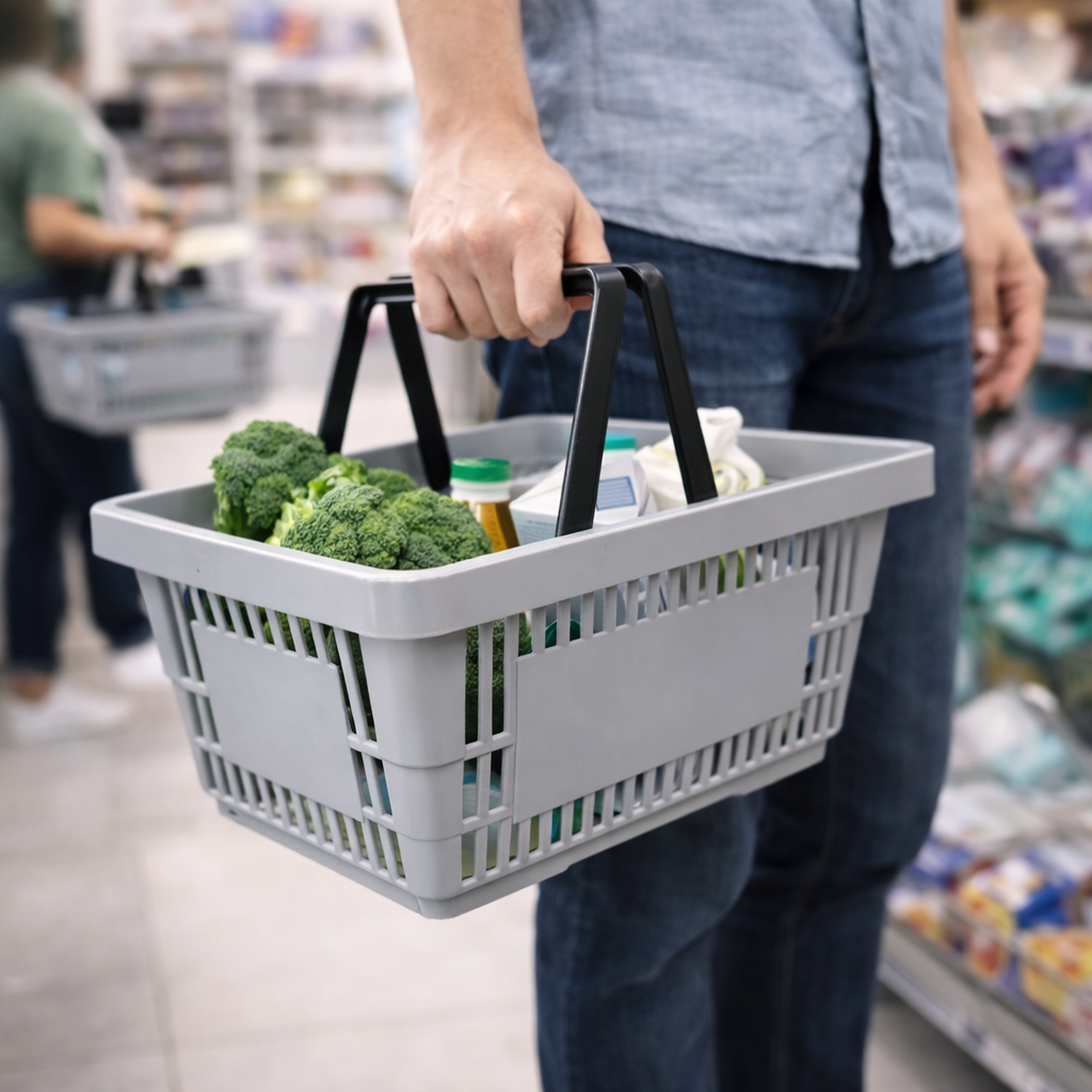 Der praktische Einkaufskorb aus Plastik hat 2 Tragegriffe. Das Fassungsvermögen dieses Korbs liegt bei ca. 22 l. Der Einkaufskorb ist beliebig stapelbar und in der Farbe Grau. Ein Muss für jedes Ladengeschäft!