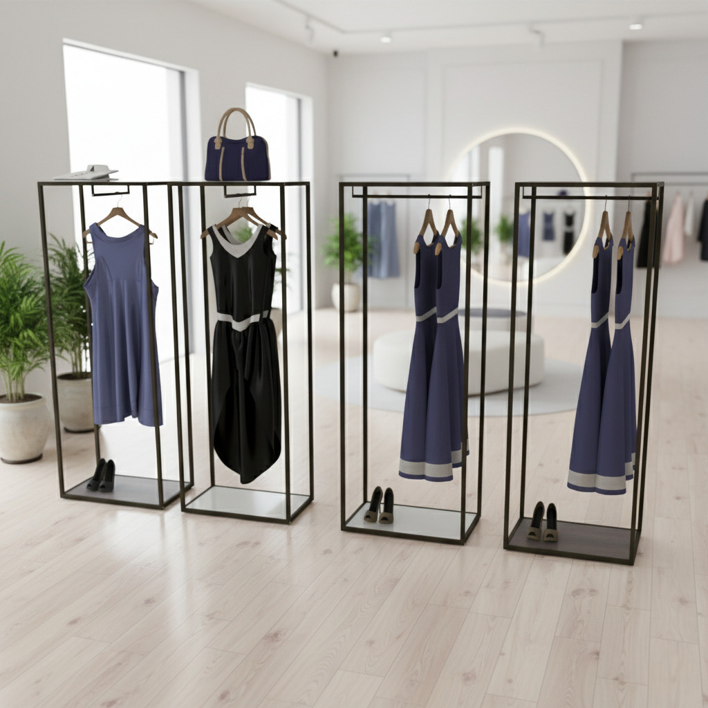 - Extras: integrierte Kleiderstange für hängende Ware