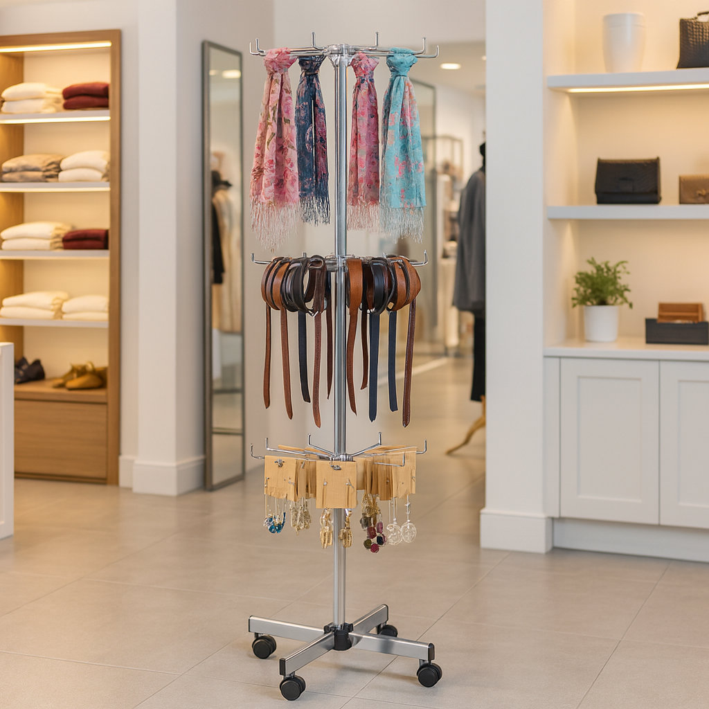 - Besonderheit: ideal für Accessoires wie Schals, Gürtel, Schmuck – platzsparende 3-Etagen-Präsentation