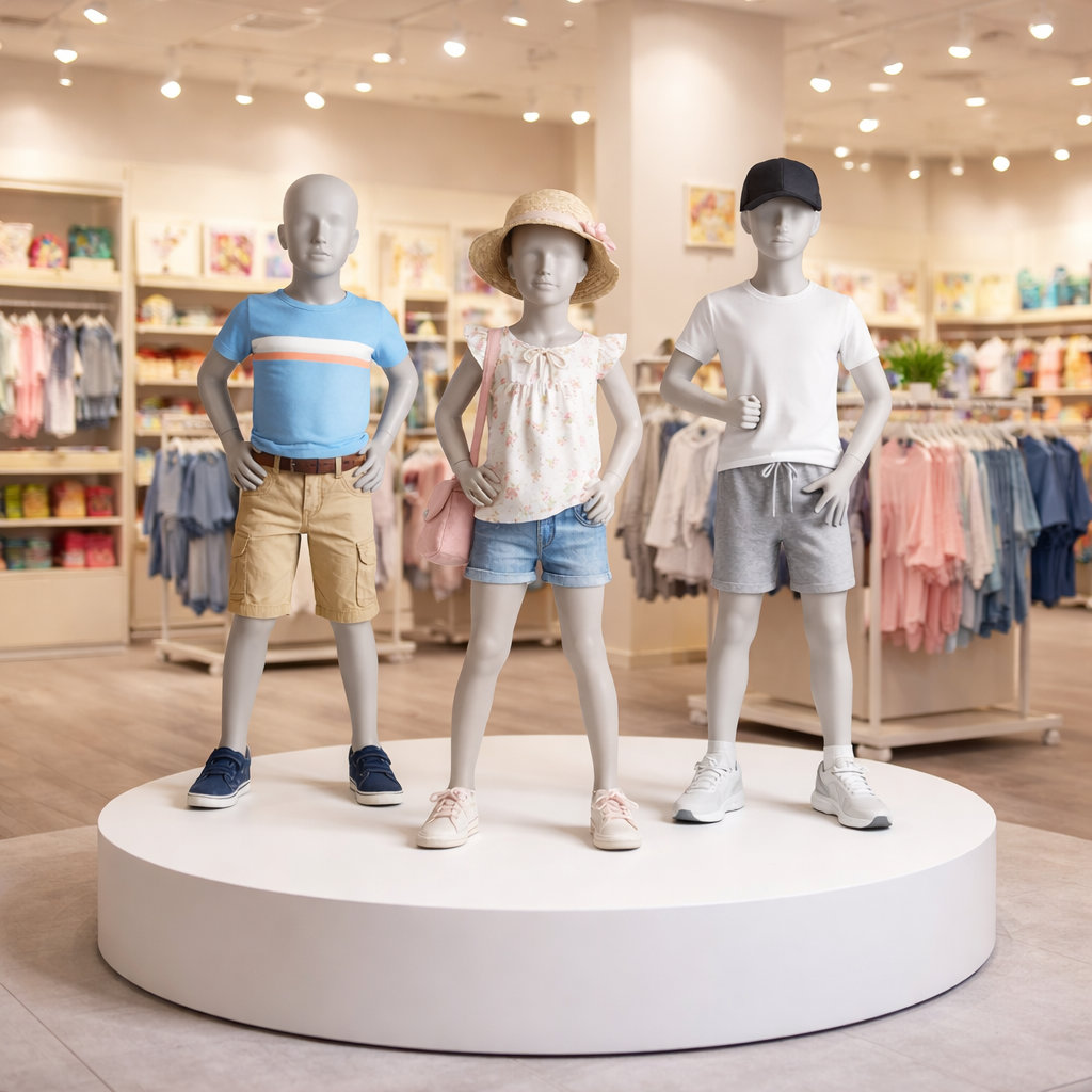 - Lieferumfang: Kinder-Schaufensterpuppe inkl. Metallstandplatte (30 × 30 cm), Handschuhe, Aufbauanleitung und Radiergummi
