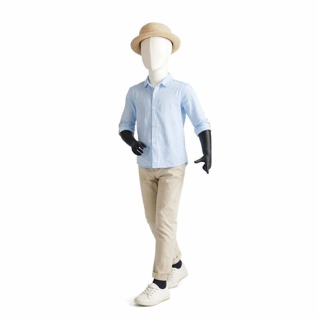 - Lieferumfang: Kinder-Schaufensterpuppe inkl. runder Glasstandplatte, Kit mit Aufbauanleitung, Handschuhe, Radiergummi