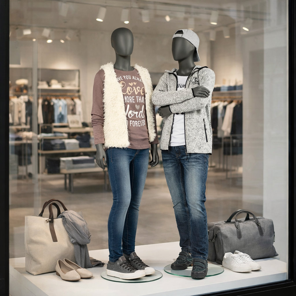 - Lieferumfang: Kinder-Schaufensterpuppe inkl. runder Glasstandplatte