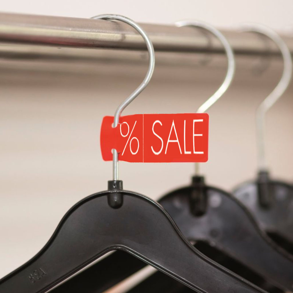Der Kleiderbügel-Anhänger ist aus dünnem Kunststoff und kann ganz einfach auf Kleiderbügel aufgesteckt werden und sollte in keiner Textil Ladeneinrichtung fehlen.