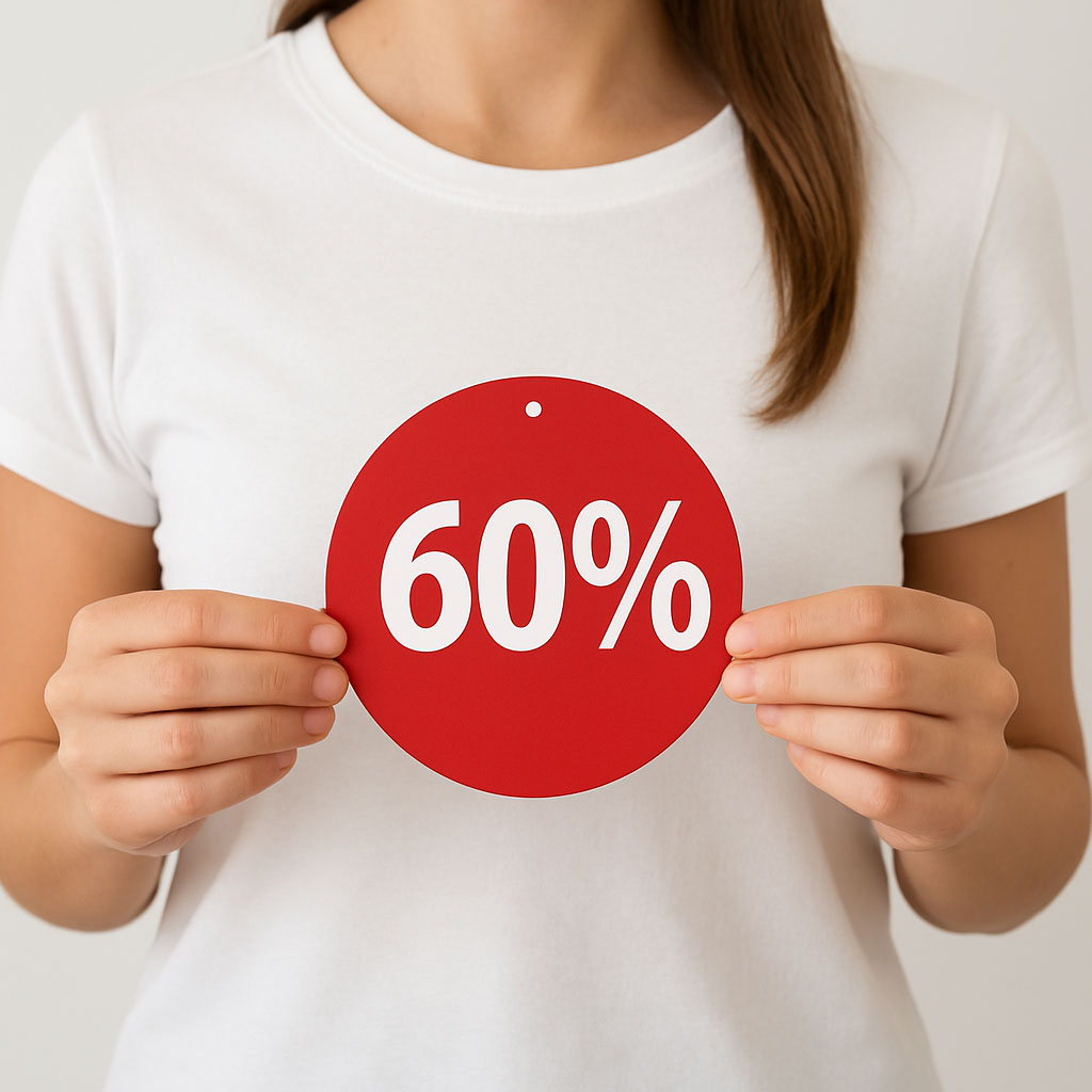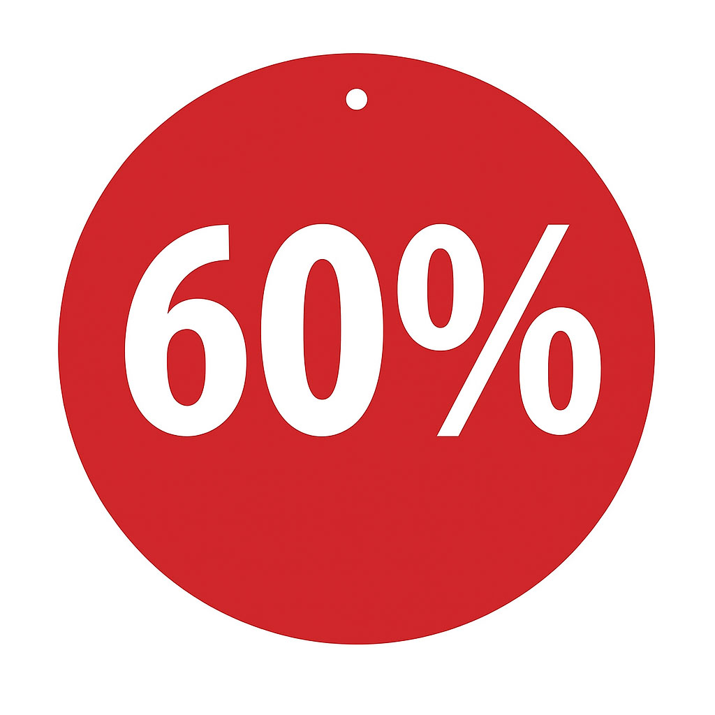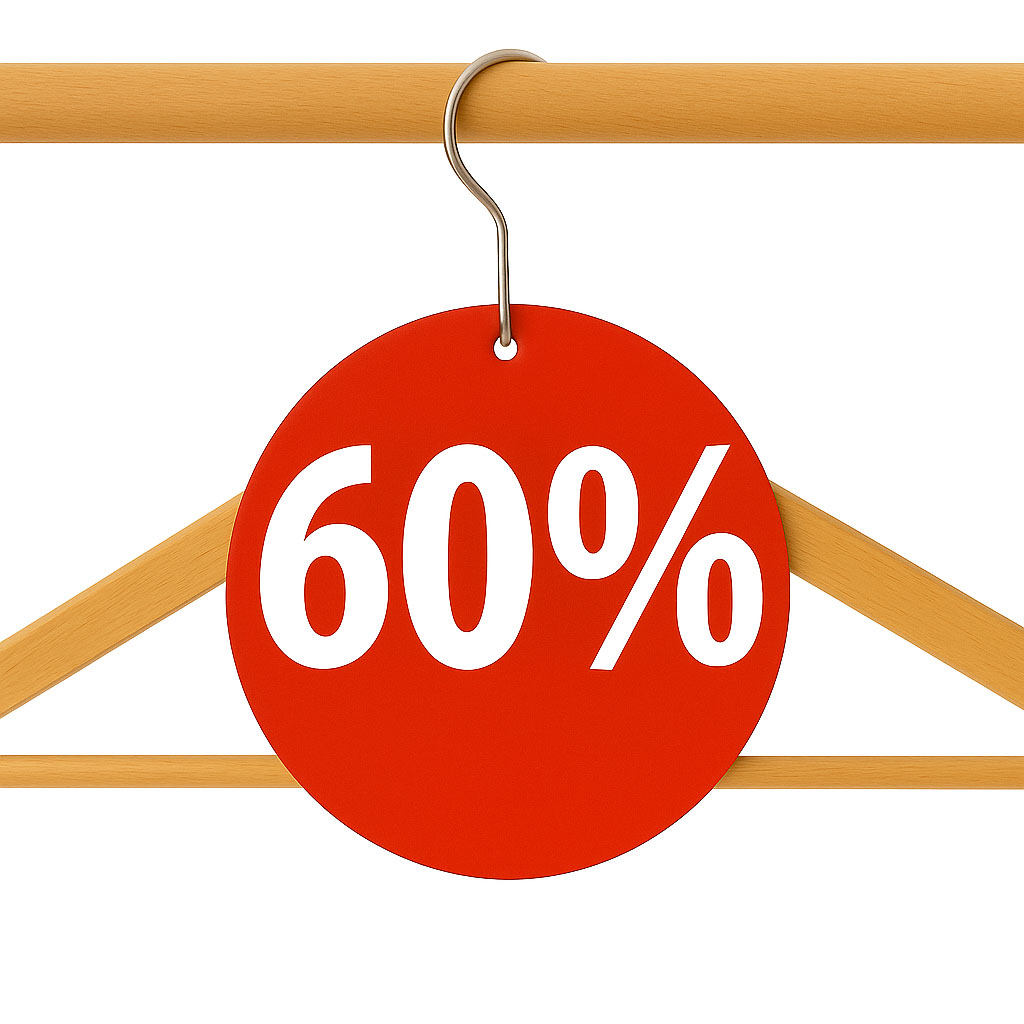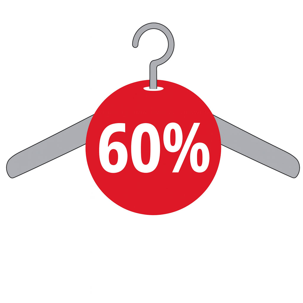 Für die Rabattkennzeichnung direkt am Kleiderbügel eignet sich dieser doppelseitige Hänger aus Karton. Der Hänger ist rot mit weißem '60%' Aufdruck. Der Durchmesser ist 12 cm, die Verpackungseinheit 10 Stück.