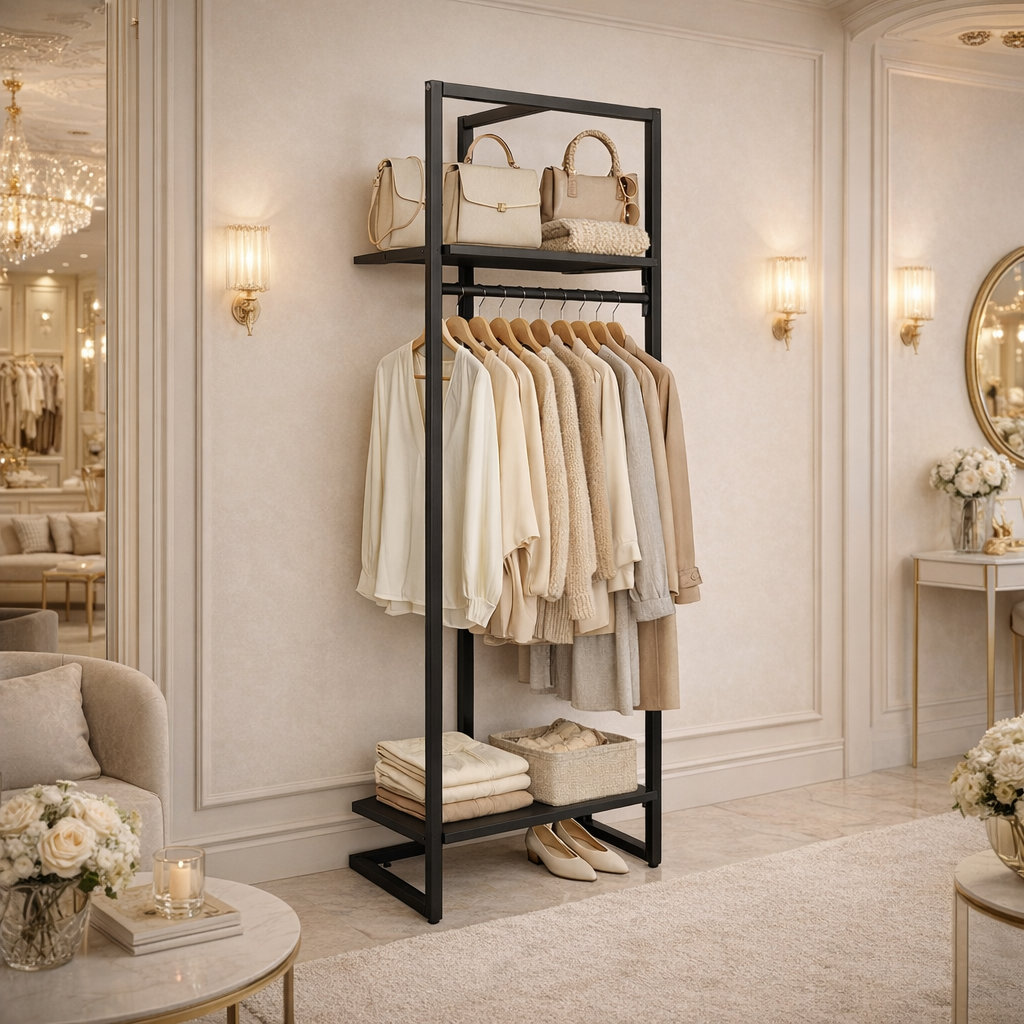 Die Zubehörteile, wie Konfektionsstange & Fachböden und Konsolen für Fachböden sind im Set inbegriffen!