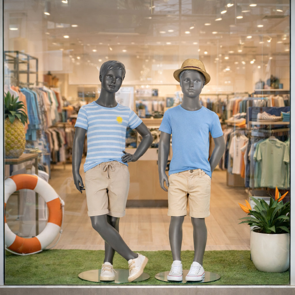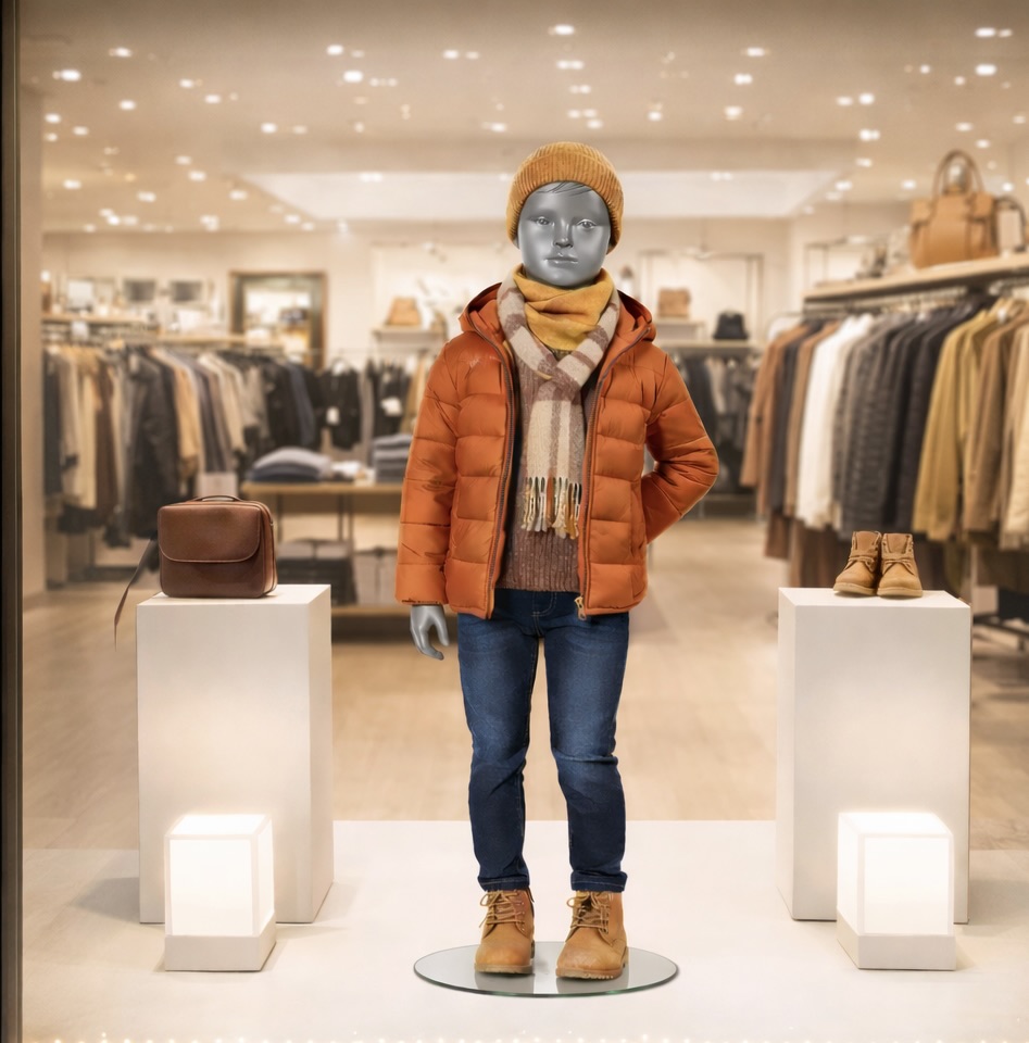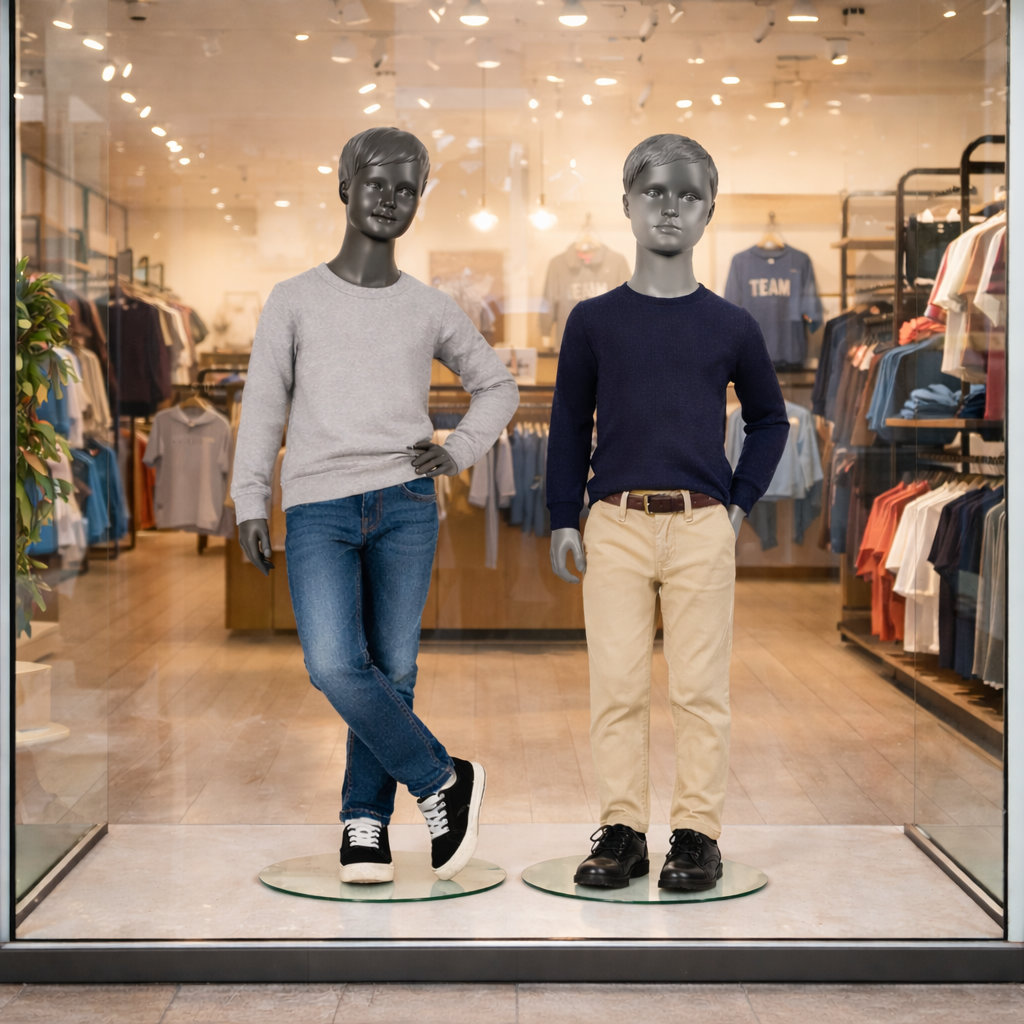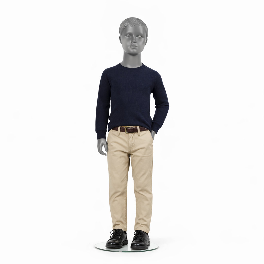 - Lieferumfang: Kinder-Schaufensterpuppe inkl. runder Glasstandplatte