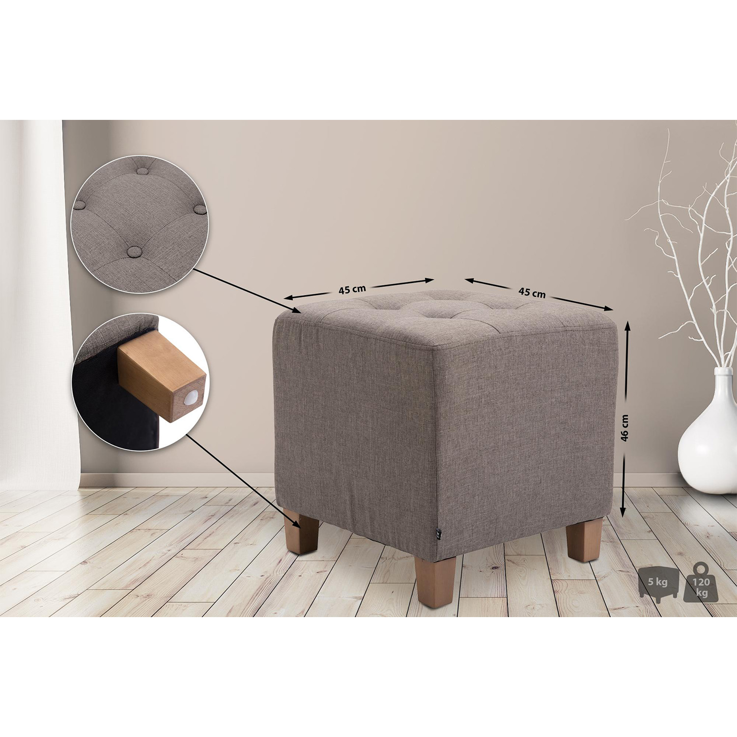 Dank seiner kompakten Maßen (B45 x T45 x H46 cm) bietet der Hocker maximalen Sitzkomfort bei minimalem Platzbedarf. Der strapazierfähige Stoffbezug sorgt für eine lange Lebensdauer und ist besonders pflegeleicht.