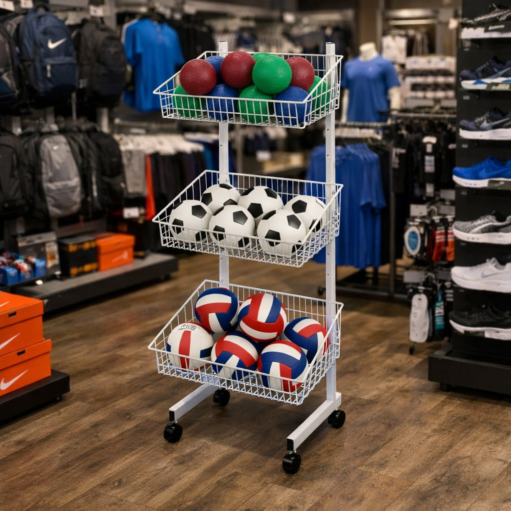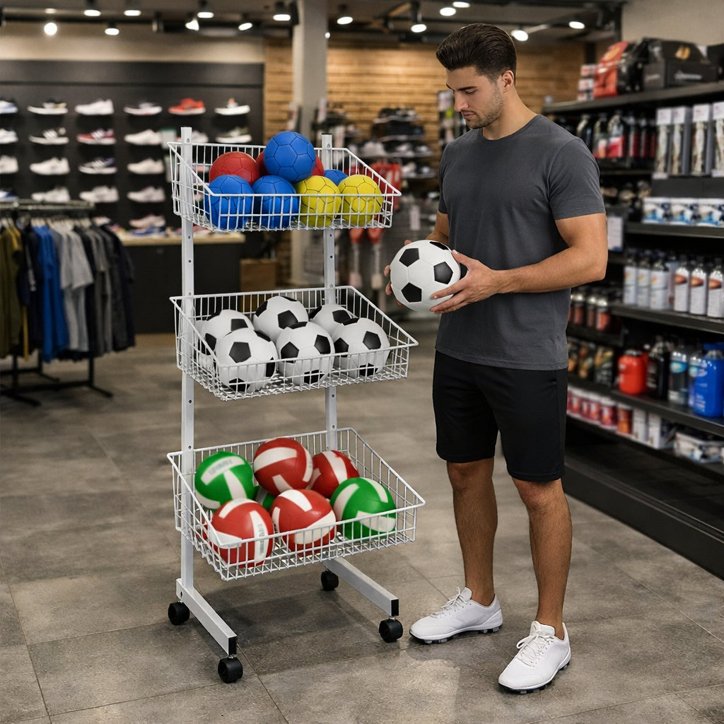 Dieser Korbständer fahrbar mit 3 Körben B60cm ist ein praktischer Helfer für die Ballpräsentation.