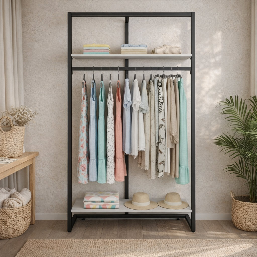Moderne Gondel für die Warenpräsentation von Textilien im Textilgeschäft. Der Rahmen ist aus vierkantigem Metall mit 30x30 mm und in Farbe Schwarz.
