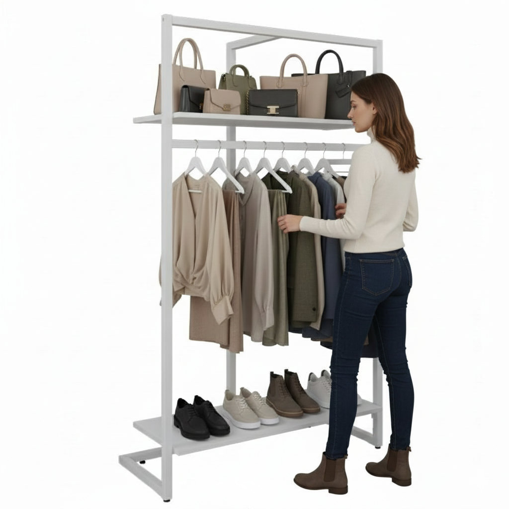 Moderne, weiße Gondel für die Warenpräsentation von Textilien im Textilgeschäft. Der Rahmen ist aus vierkantigem Metall mit 30x30 mm und in Farbe Weiß.